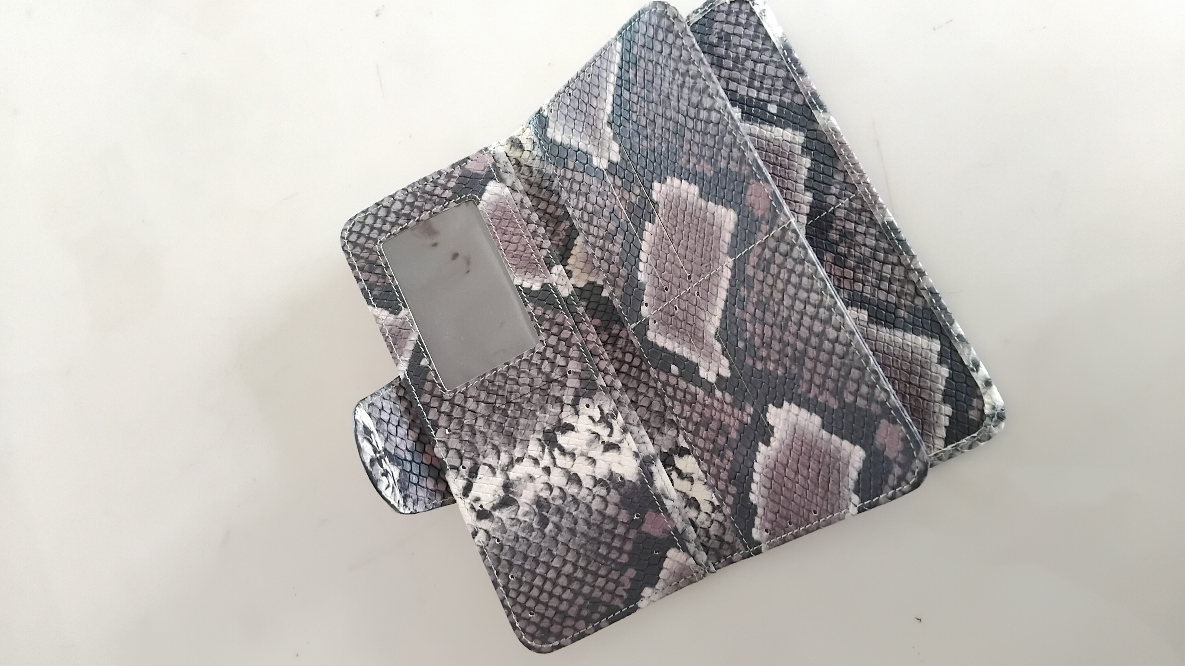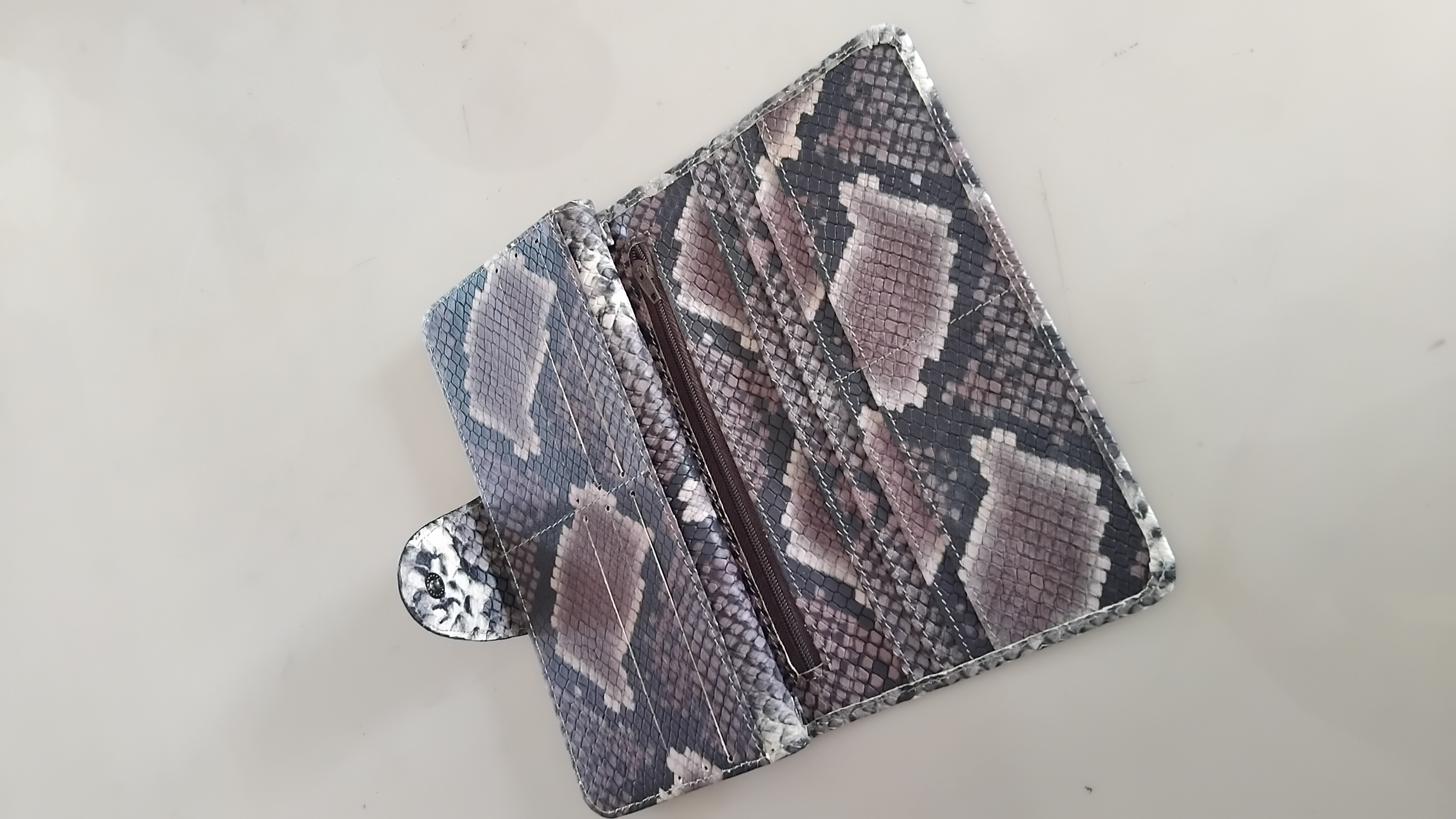 Dompet wanita terbuat dari kulit sapi yang diproses menjadi motif kulit ular.