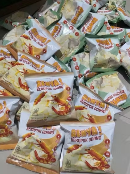 krupuk renya rasa udang/bawang . 1 dus isi 200 pcs. per pcs berat 10gram